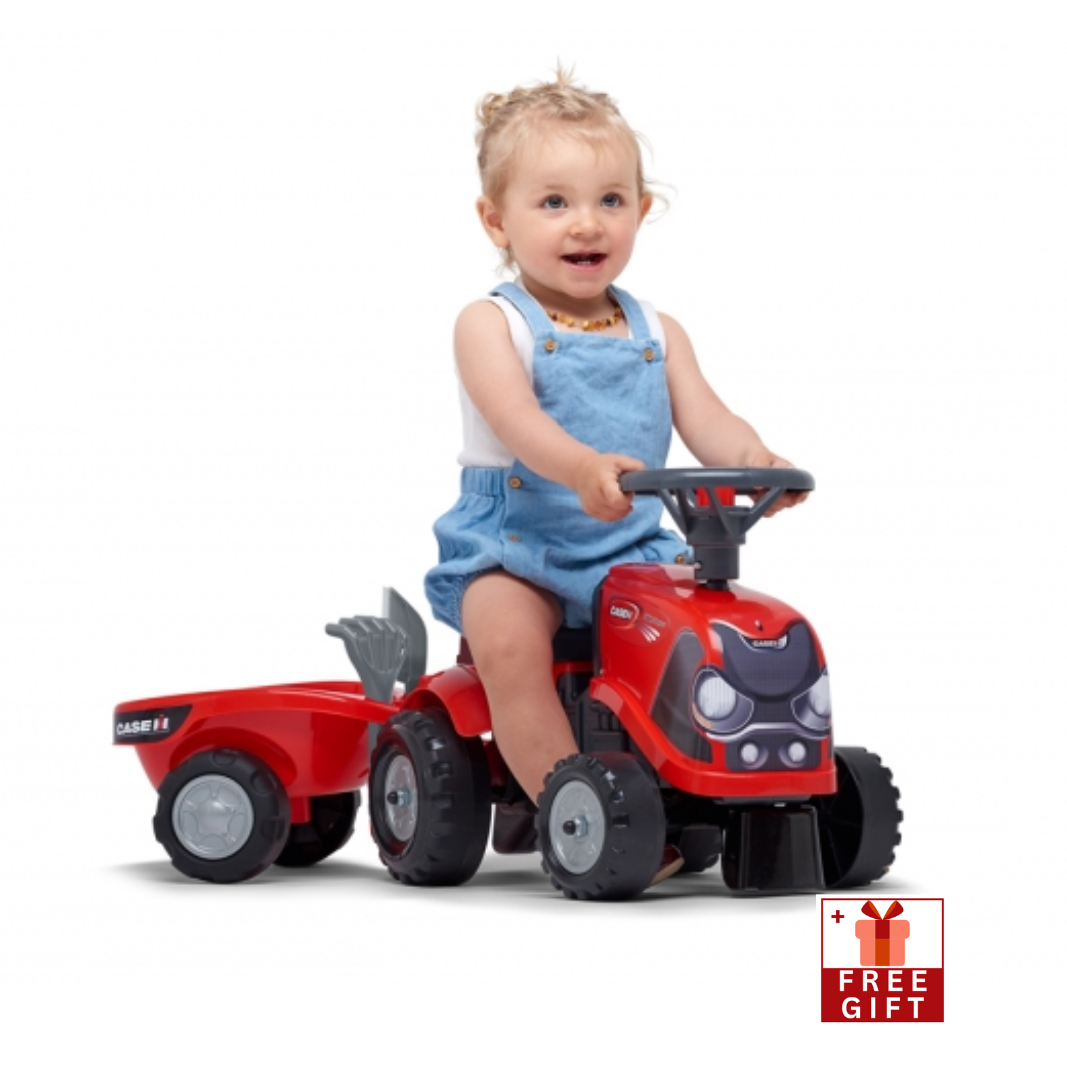 Falk Case CE Tractor with Trailer, Rake, and Shovel, Perfect Ride-On and Push-Along Toy Tractor for Toddlers Ages 1.5 and Up