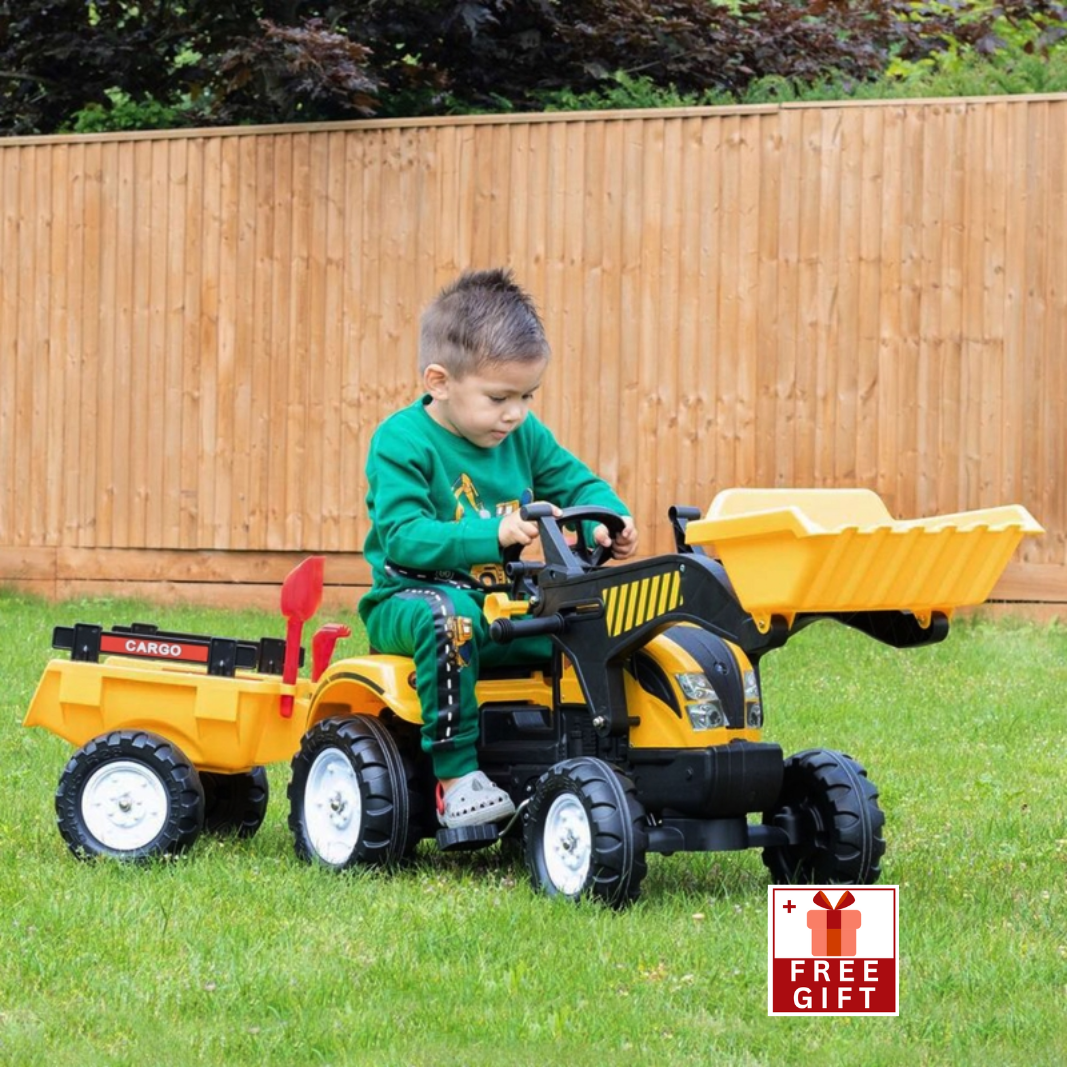Aosom Digger Ride-On Truck for Kids with Detachable Trailer, Excavator Ride-On Toy Car with Horn, Pedal-Powered Bulldozer Construction Vehicle with 6 Wheels for Outdoor Play, Yellow