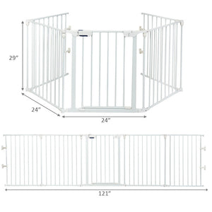 The 115-Inch 5-Panel Adjustable Wide Fireplace Fence is a versatile safety solution for your home. Crafted from heavy-duty, powder-coated steel, it serves as a playpen for toddlers or pets, a baby gate, or a safety barrier. The fence features a walk-through door with a safety lock, a configurable design that can be adjusted into various shapes, and a sturdy build for long-lasting use. It can be wall-mounted or used as a standalone unit, folds for space-saving, and is lightweight for easy transport. Ideal for doorways, hallways, and fireplaces, this fence ensures safety and flexibility.