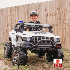 Experience the thrill of driving with our 12V Kids Electric 2-Seater Ride-On Police Car SUV Jeep Toy. This rugged and stylish police ride-on car features elevated suspension, off-road-style tires, and custom wheels, allowing kids to ride at speeds of 1.9-3.1 mph. With realistic features such as an LED light bar, headlights, taillights, and illuminated dashboard gauges, this power wheels cop car provides an authentic driving experience.