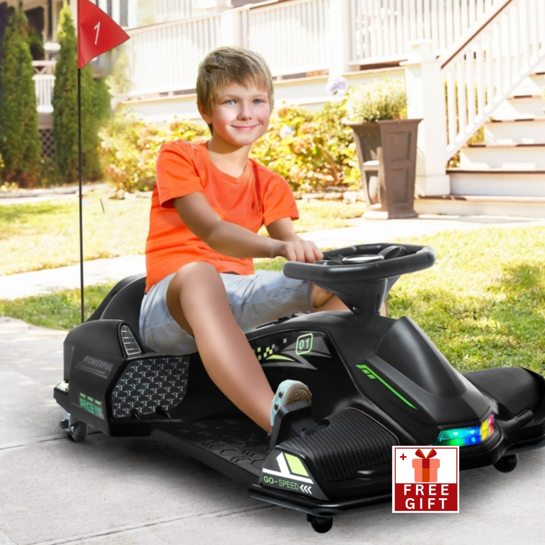 12V Electric Drifting Ride-On Go Kart with Slow Start, Music, Lights, Black