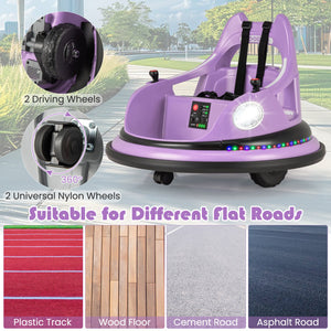 The 12V Kids Ride-On Bumper Car with Remote Control and Dual Joysticks is designed for thrilling fun and safety. It features 360° rotatable wheels, dual 12V motors, and a 12V 4.5AH battery for a dynamic ride. Parents can control the car with the included remote, while kids enjoy manual control. With a slow start/stop system, ASTM and CPSIA compliance, and versatile use on various surfaces, this car ensures a secure and enjoyable experience. Additional features include a high backrest, 5-point safety belt, non-slip footrest, soft bumper, and vibrant light effects. Ideal for kids aged 3-8.