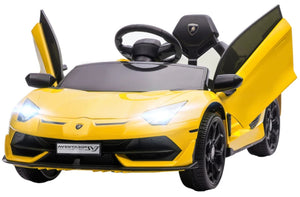 Introducing the coolest ride on the block, the licensed Lamborghini Aventador SVJ Roadster kid's electric car. Your child will hit the road in style with built-in music, horns, and captivating lights that create a realistic driving experience. With its sleek and stylish look, this Lamborghini 12v ride on is the perfect set of wheels for the young thrill-seeker in your life.