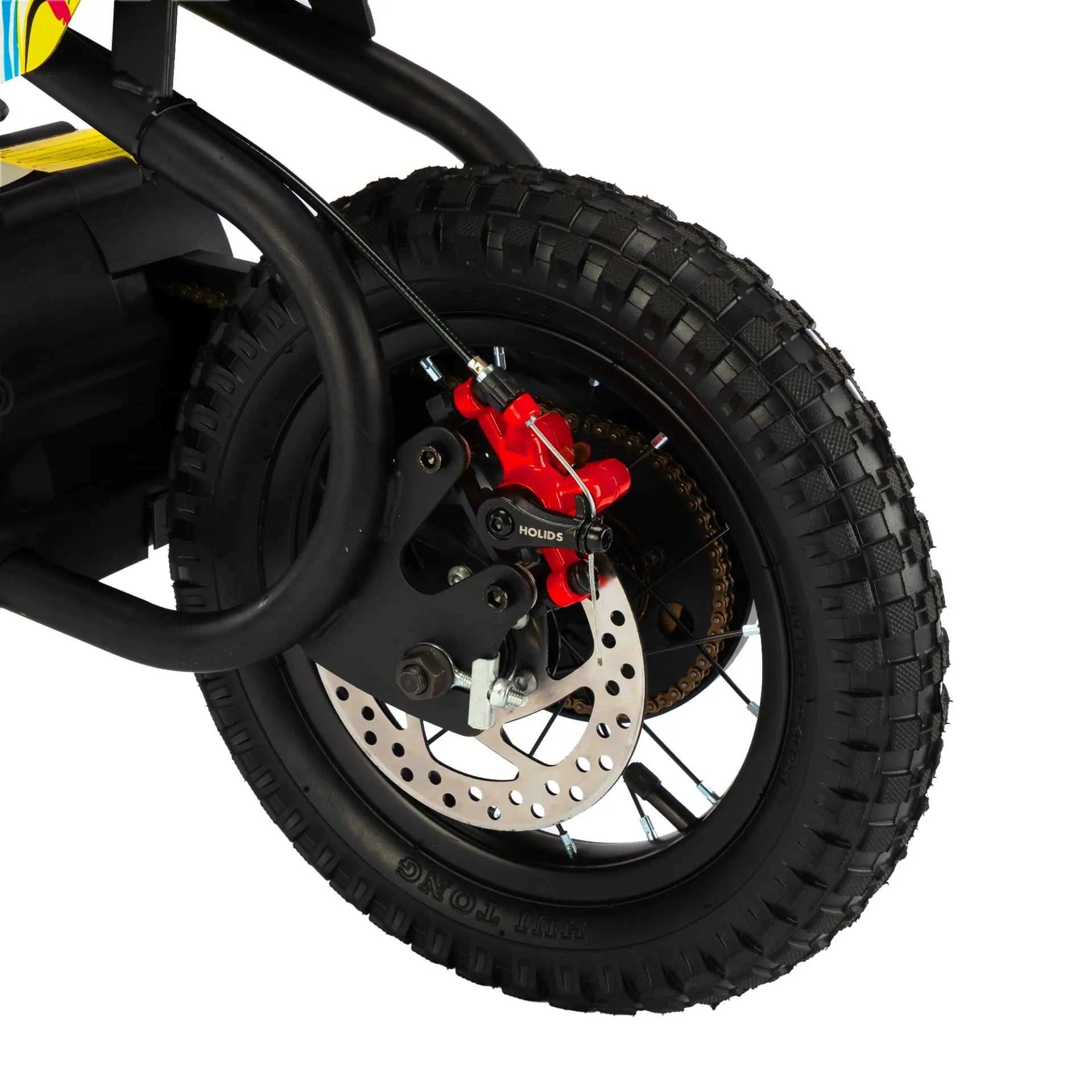 Crafted with a durable iron frame and designed to handle rough terrain, this ride-on bike supports up to 176 lbs—making it perfect for growing kids and tweens. Featuring three adjustable speed modes, front and rear disc brakes, and a manual hand brake, your child will stay in command of every ride with maximum safety and precision.