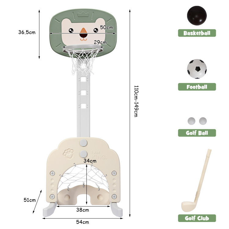 - 3-in-1 Toy Sports Set: Offers basketball, soccer, and golf games, promoting physical activity and skill development. Includes basketball, soccer ball, golf balls, and a golf club for versatile play.