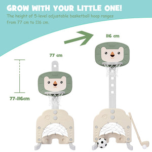 Discover the 3-in-1 Adjustable Kids Basketball Hoop Set, perfect for indoor and outdoor play. This versatile toy sports equipment offers basketball, football, and baseball activities to boost kids' coordination and teamwork. With five adjustable heights, it's suitable for ages 2 to 7. Made from non-toxic, eco-friendly materials, it features a stable base that can be filled with sand or water for added safety. ASTM and CPSIA certified, this durable set ensures fun and development while being easy to assemble and clean. Ideal for promoting active play and skill development.
