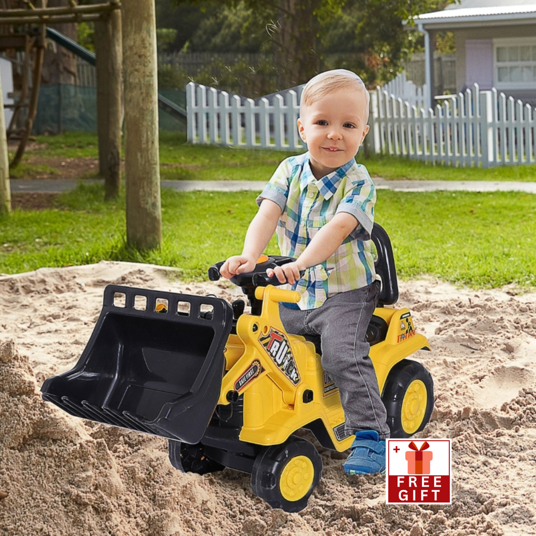 Cruise around, create a play construction zone, and store toys with our 3-in-1 Ride-On Toy Bulldozer Digger Tractor Pulling Cart. This versatile toy tractor allows your child to move the bulldozer forward and backward, and scoop up dirt, sand, and more with the large shovel. The under-seat storage space makes clean-up after playtime a breeze, allowing your child to store their toys within arm's reach. Encourage imaginative play and keep your child entertained for hours with this fun and functional ride-on toy.