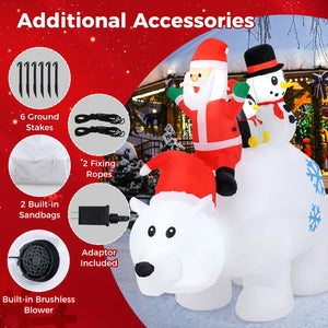 Create a magical holiday display with this 6 ft Animated Polar Bear Christmas Inflatable featuring Santa, a snowman, and a penguin. Its head-shaking motion and bright built-in LED lights capture attention day and night. Perfect for both indoor and outdoor use, this durable inflatable is made from IP44 water-resistant fabric to withstand rain, snow, and sunshine. It includes built-in sandbags, ground stakes, and ropes for stability. With easy setup and a powerful blower, it inflates in minutes, bringing festive cheer to your yard or home with minimal effort.