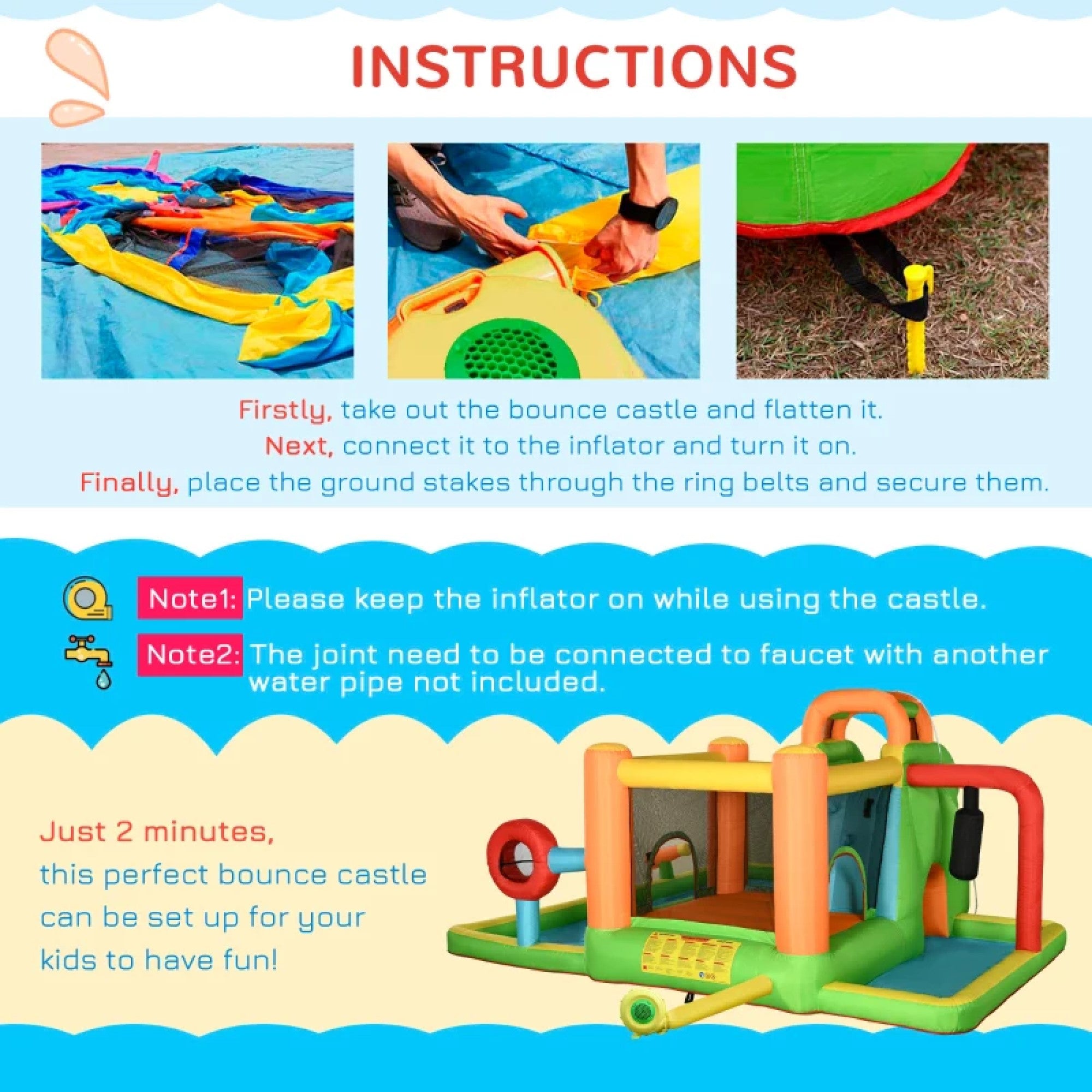Transform your backyard into the ultimate water park with our 7-in-1 Inflatable Water Slide and Bounce House. This inflatable playset features a Slide, Trampoline, Pool, Water Cannon, ball target, Boxing Post, and Tunnel, providing endless fun and excitement for kids. With its quick inflation time, durable construction, and versatile design, this bounce house is perfect for children aged 3-8 years old.