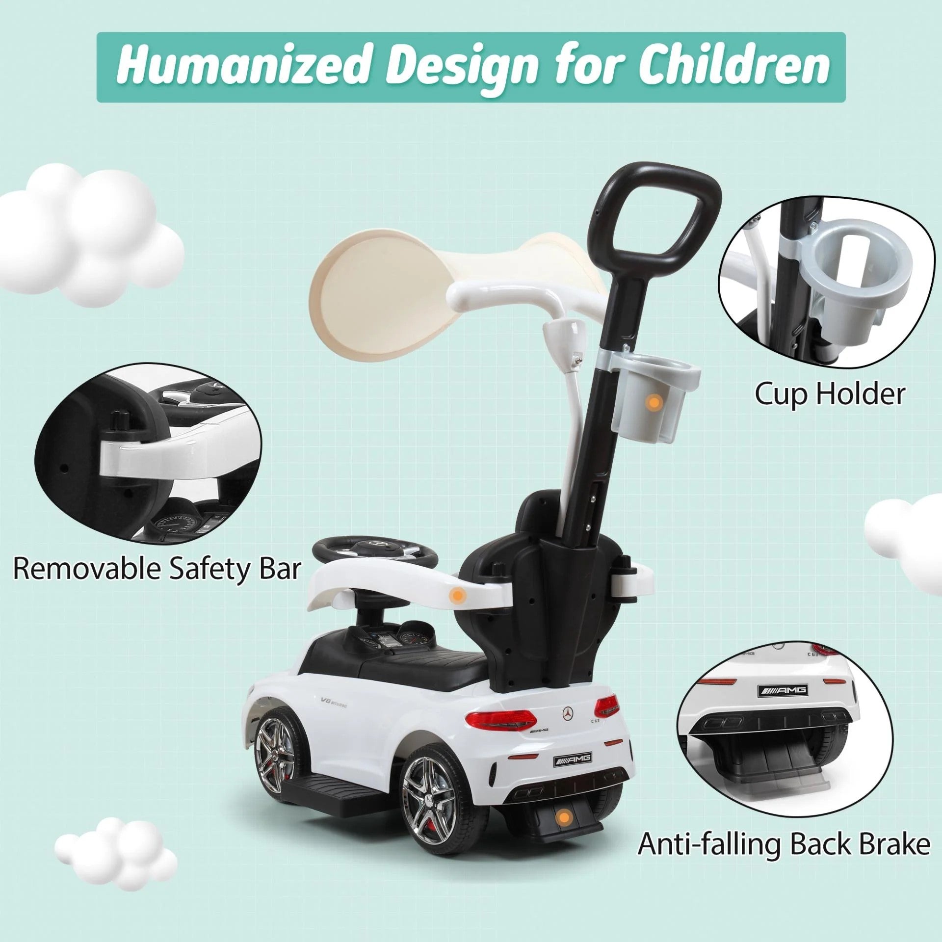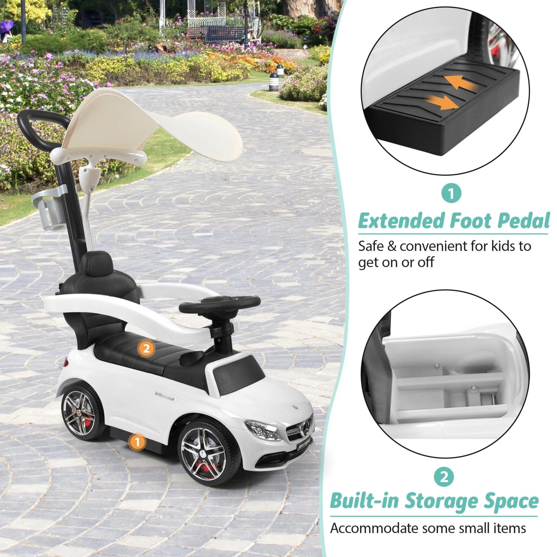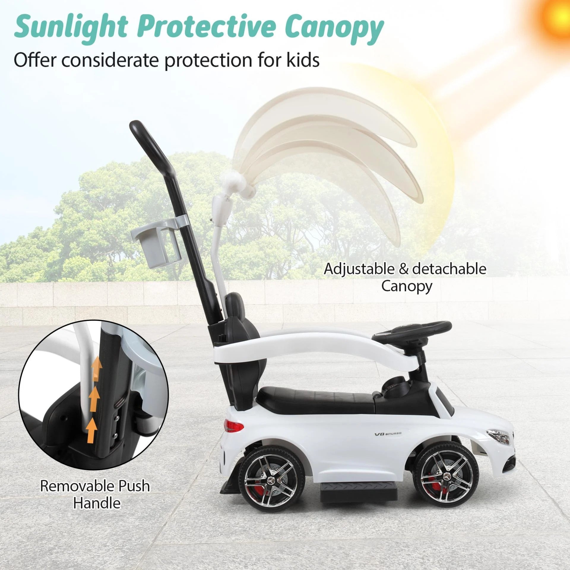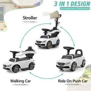 Tobbi Mercedes Benz Kids Ride On Toy Car, 3 in 1 Push Car Stroller for Toddlers With Removable Canopy, Handle, White - Toys Ride, Mercedes Toy Car Stroller