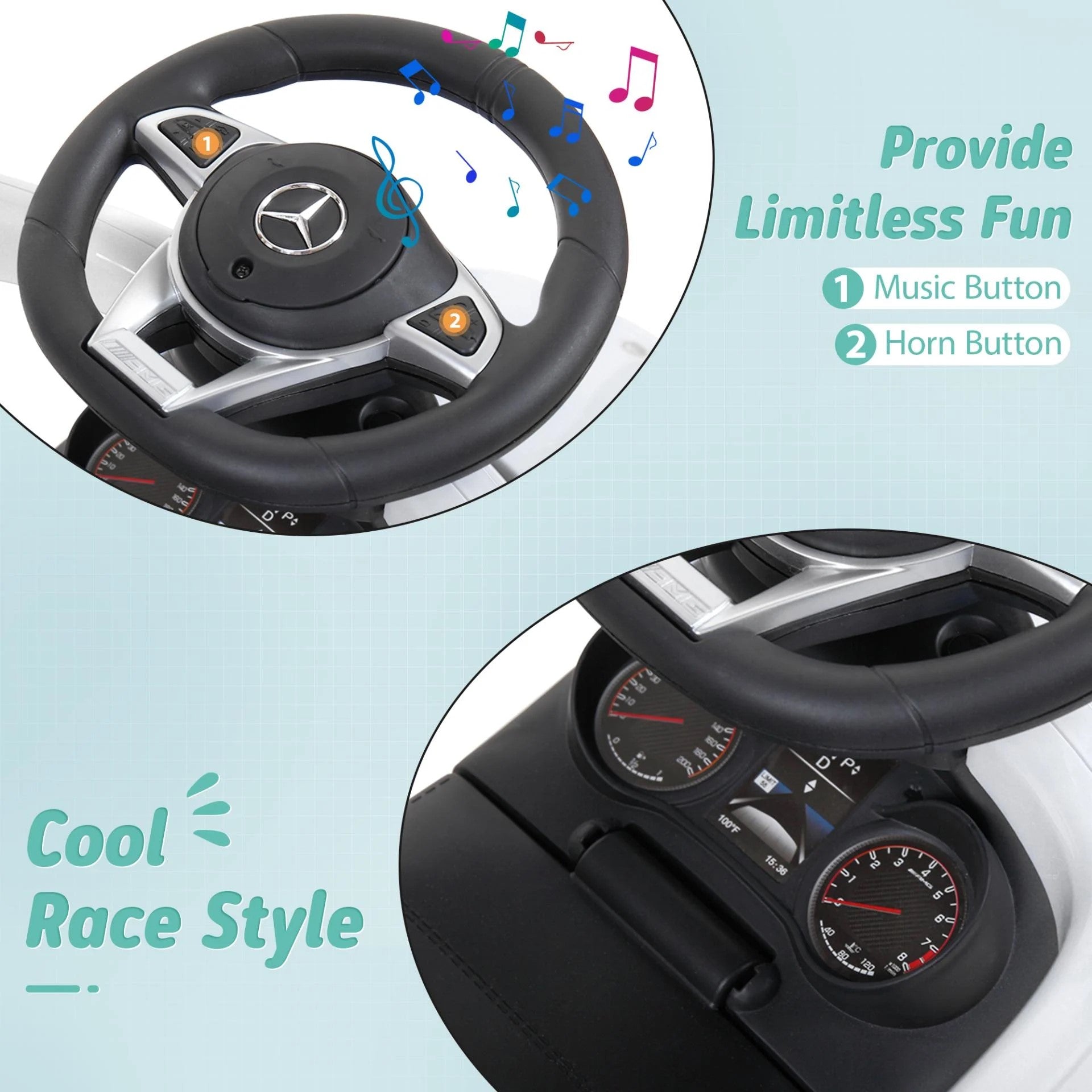 - Mercedes-inspired design: Features the iconic Mercedes-Benz logo and replica details for an authentic driving experience.