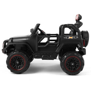 Introducing our new black 12V Children's Electric Ride-On Cars! Let your child experience the joy of cruising in their very own car, complete with a comfortable seat and music for an enjoyable ride. With a steering wheel and foot pedal controls, your child can fully operate the car or you can take control with the remote control option. Perfect as a gift for kids and equally entertaining for adults who want to join in the fun. These electric toy cars are designed for both outdoor and indoor play, offering a safe and easy operation on flat surfaces. Crafted from durable plastics, these ride-on toys ensure a smooth and enjoyable adventure for your little one. Get ready for your child's biggest adventures with our scaled-down, but larger-than-life, electric ride-on cars. Ideal for those looking for a thrilling Jeep toy with remote control capabilities.