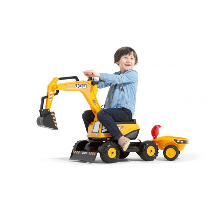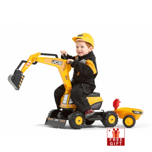 Falk JCB Wheeled Excavator with opening seat, Trailer with shovel and rake and construction manager helmet included, Ride-on +3