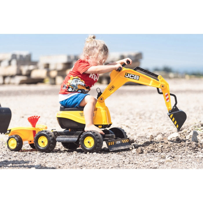 Ride on tractor with helmets on and sleeves rolled up, young builders are ready to tackle any project! The JCB farm toy excavator, with its 360° rotating cab on a 4-wheel chassis, working seat, and fully articulated mechanical shovel, is perfect for adventurous play. Specially designed for children aged 3 to 7 years, this miniature construction machine is 100% made in France, ensuring durability and countless hours of fun. Whether digging a pool for parents or uprooting granny's massive tulips, the possibilities for imaginative scenarios are endless with this childrens ride on tractor!