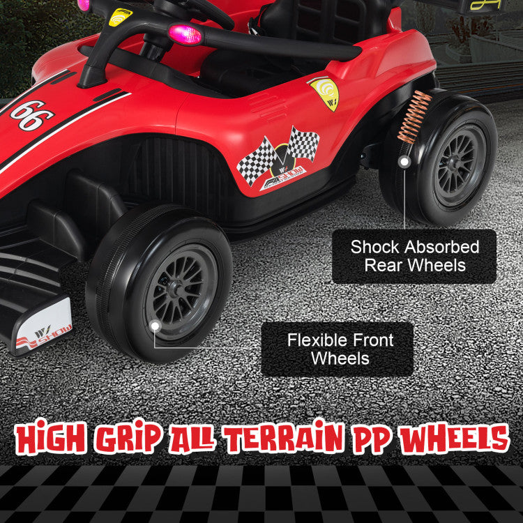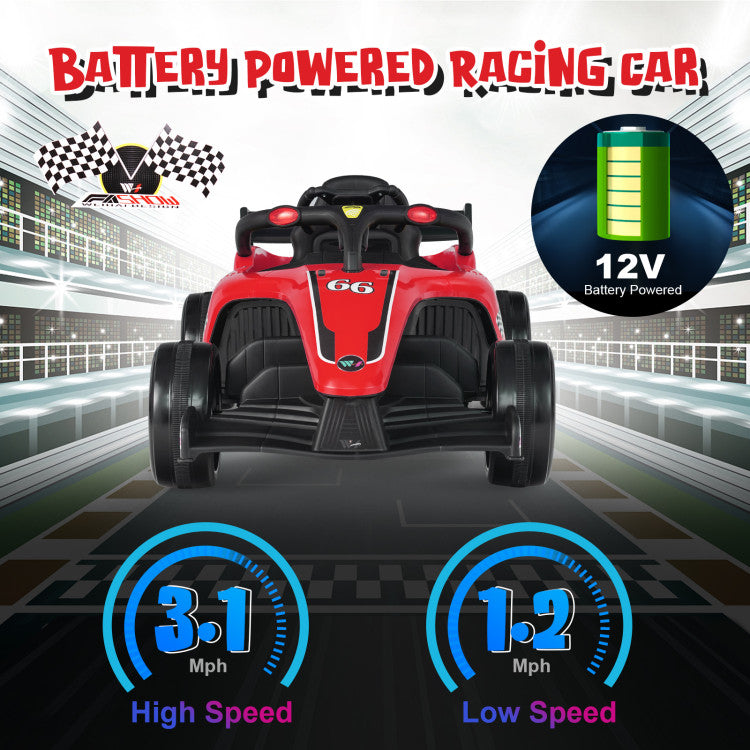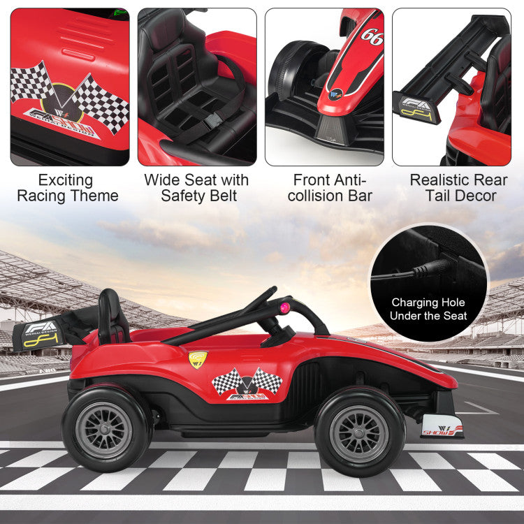 Ignite your child's imagination with our 12V Kids Ride-On Electric Formula Racing Car, designed for thrilling adventures and ultimate safety! This super-cool racing car for kids features a domineering outlook with realistic horn sounds, dashing head, and tail lights, making your little one the envy of the neighborhood.