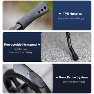 - Safety features include a rear wheel brake and large handlebars for a secure grip