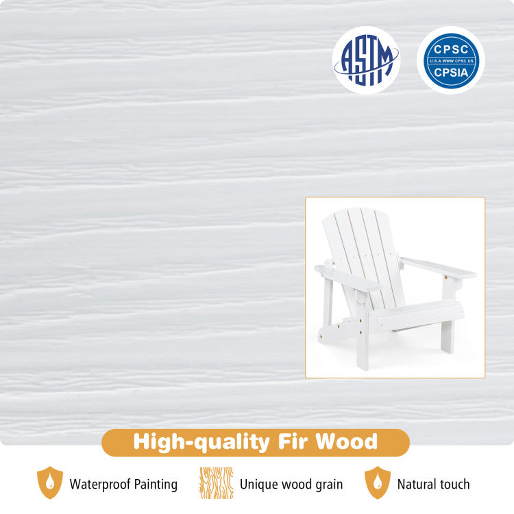 Discover the Kids' Adirondack Chair with High Backrest and Armrests, designed for durable outdoor use. Made from natural fir wood and coated with waterproof paint, this chair withstands weather and is ideal for balconies, backyards, and poolside areas. Featuring ASTM and CPSIA certifications for safety, it includes a high backrest and wide armrests for comfort. Reinforced with a triangular structure, it supports up to 110 lbs, ensuring stability. Perfect for various outdoor settings, this chair combines style and functionality for a cozy outdoor experience for your child.