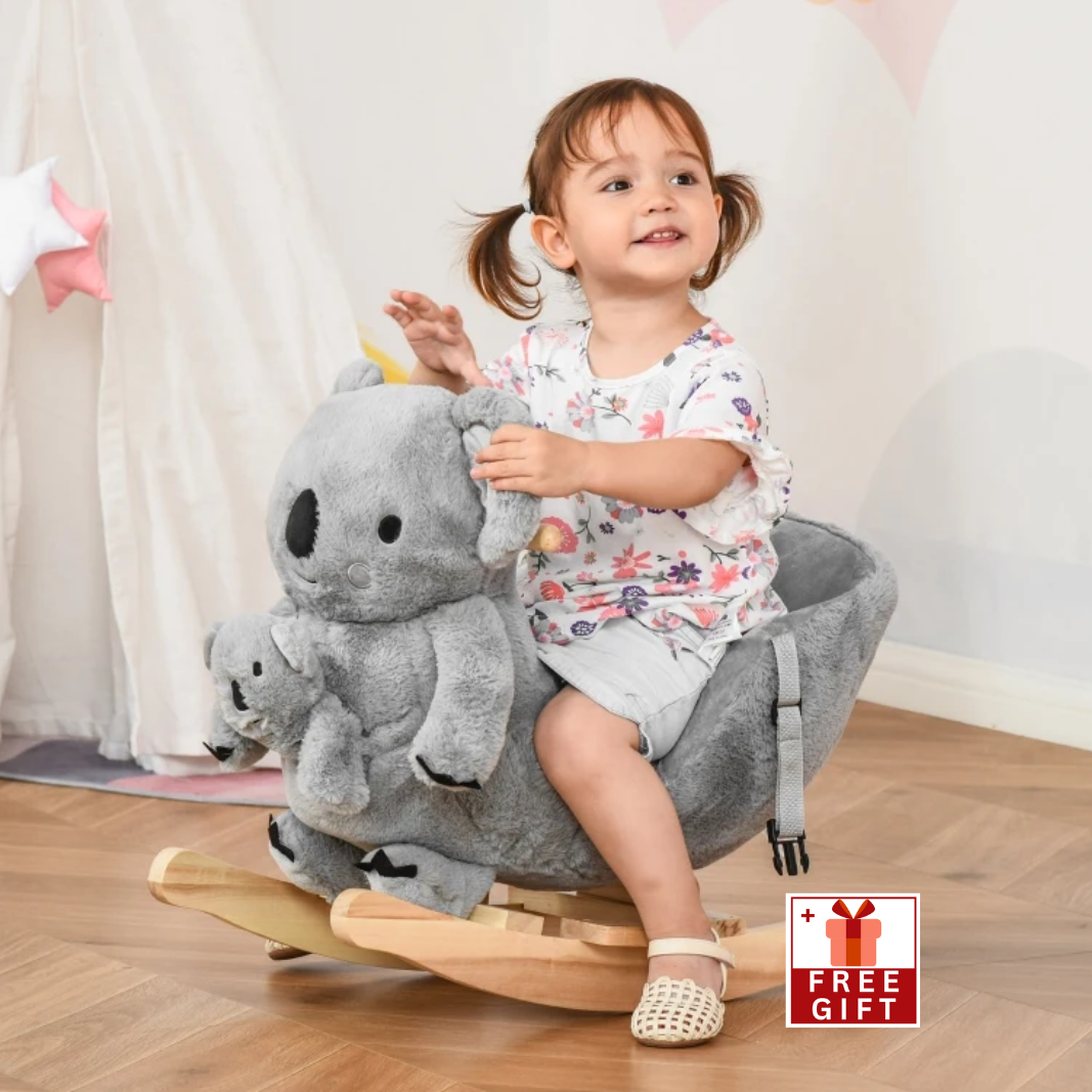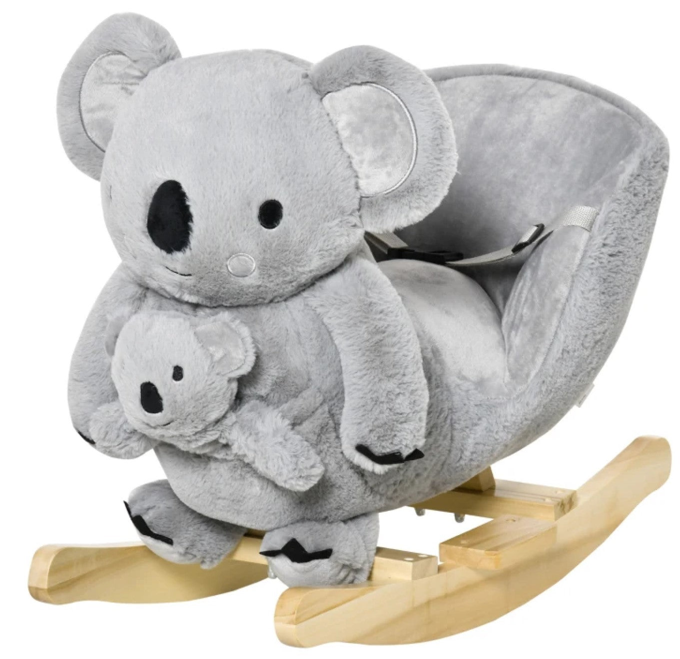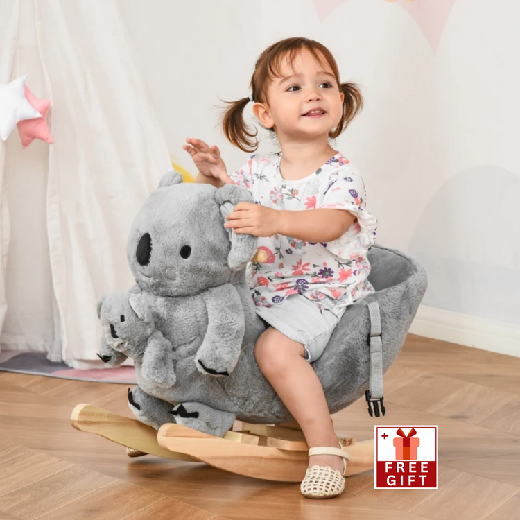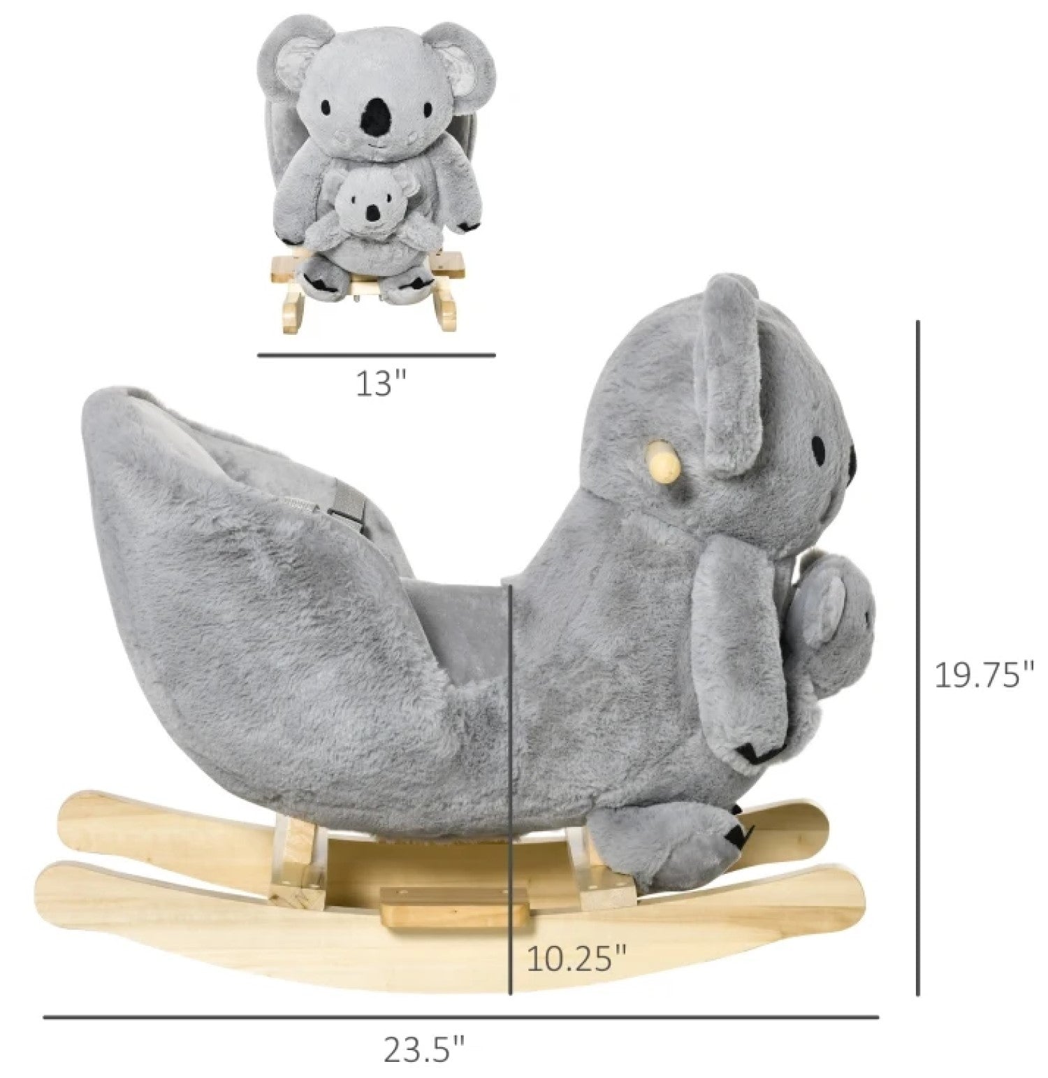 With this adorable rocking toy styled after a koala, children will have a unique companion for their imaginative adventures. Rocking toys can help improve mobility, inspire independent and group play, strengthen core muscles and arms, and enhance balance. This rocking toy also features simulated animal sounds, adding an extra element of fun and engagement. It's a wonderful way to create lasting memories and share the joy of a beloved toy from your own childhood with your child. Features a traditional rocking design with a playful koala twist, Helps strengthen core muscles, arms, and balance during play, Wooden base with curved rails allows for gentle rocking motion, Soft and huggable body with a comfortable padded seat for extended play sessions, Press the ear for entertaining animal sounds, Recommended for ages 18-36 months old, Assembly required.