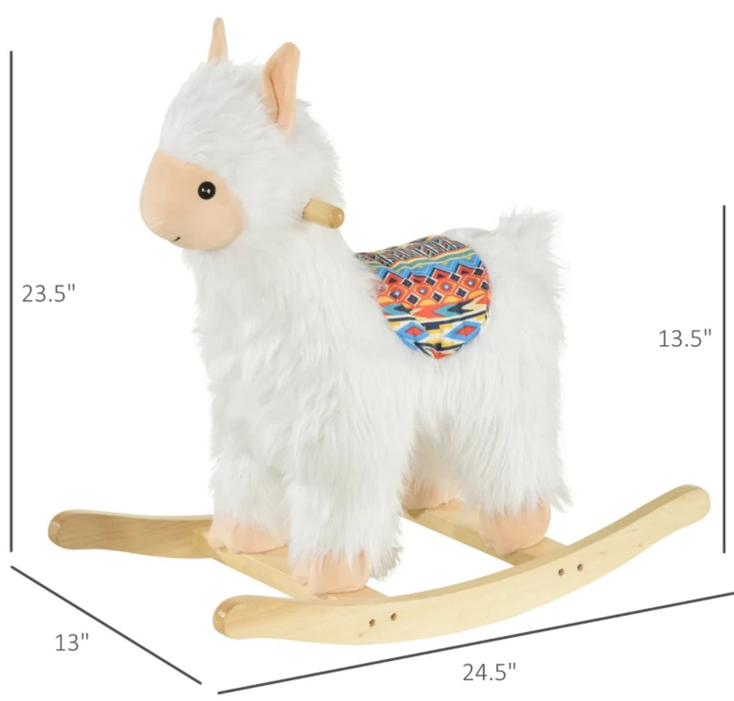 - High-Quality Stylish Design: Built on a sturdy wood base with a reinforced steel frame, this rocking toy is covered with a soft plush material that kids adore. The wooden bottom features two curved rails, allowing the llama to rock forward and backward smoothly.
