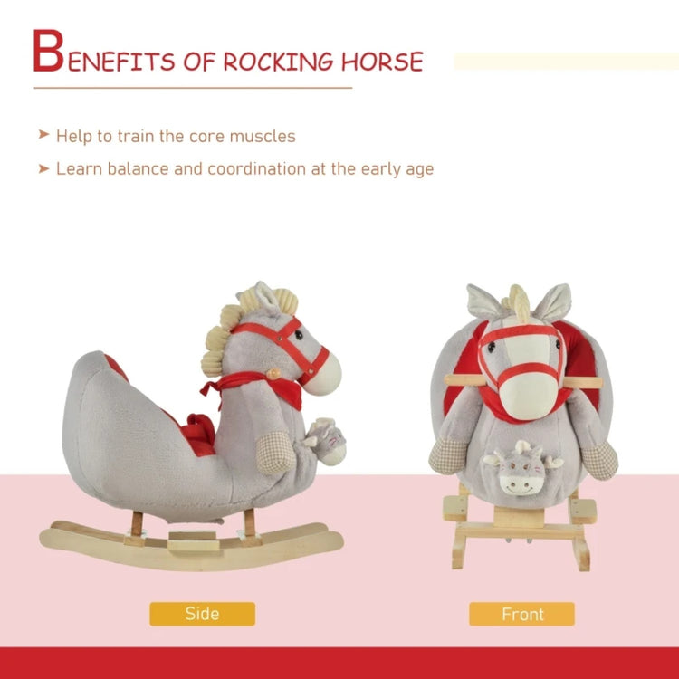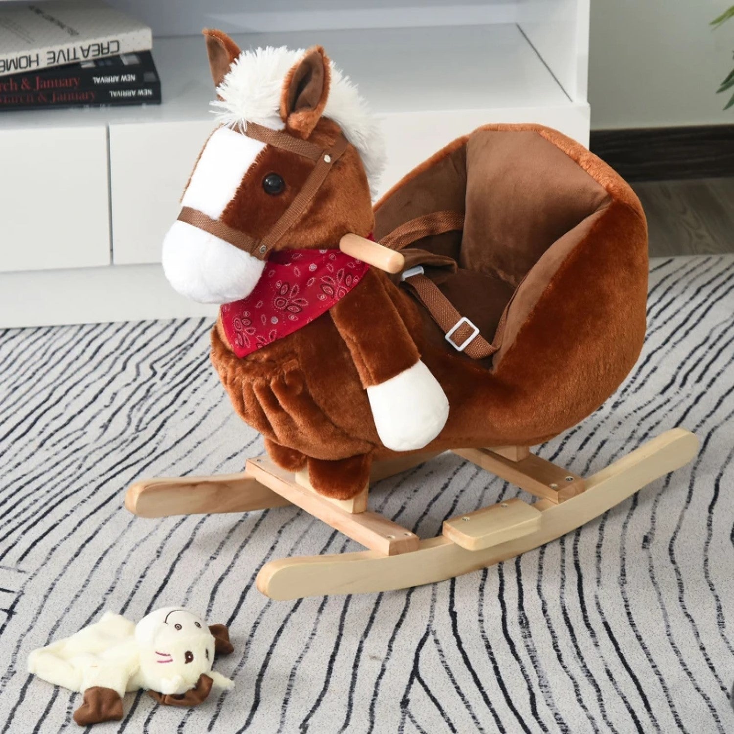 Introducing the Qaba plush rocking horse, the perfect riding toy for your little one! Designed with comfort in mind, this rocking chair features a wooden frame lined with soft plush for a cozy feel. The sturdy poplar wood and reinforced steel rocking frame ensure stability and durability, giving you peace of mind while your child plays. For added fun, simply squeeze the ear to hear the rocking horse sing a song! The cute horse design is sure to attract your child, and the wide seat with a security belt and easy-grip front handlebar ensure their safety. Additionally, the hand puppets in the front pocket allow for imaginative play and puppet shows. The foot pedals add convenience, and the toy operates with 3 x LR44 batteries (included). Suitable for children aged 18-36 months, the Qaba plush rocking horse is sure to provide hours of entertainment and fun!