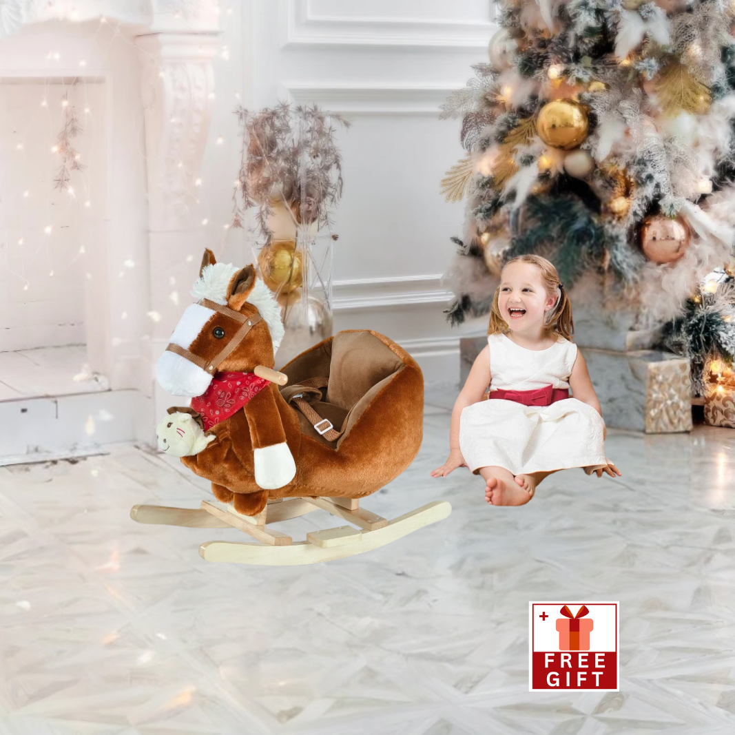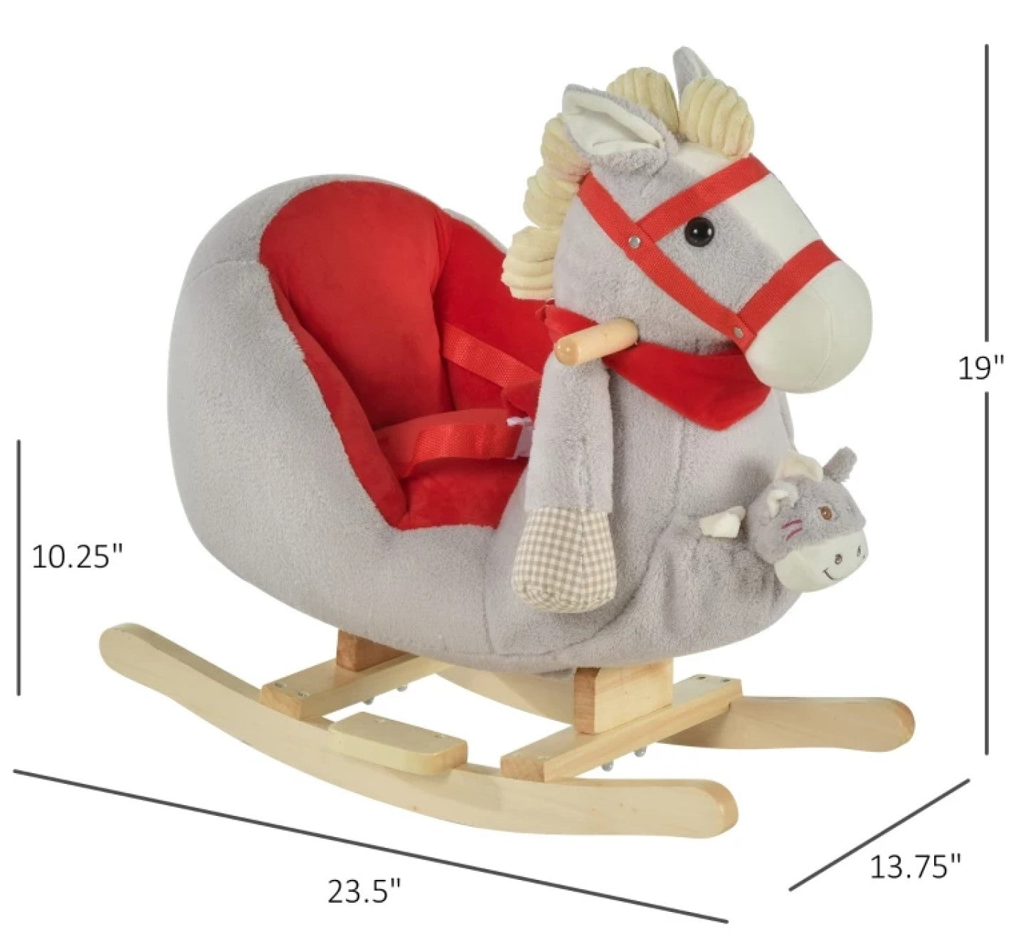 - High-Quality Stylish Design: Built on a sturdy wood base with a reinforced steel frame, this rocking toy is covered with a soft plush cover that children will love. The wooden bottom features two curved rails for a rocking motion.