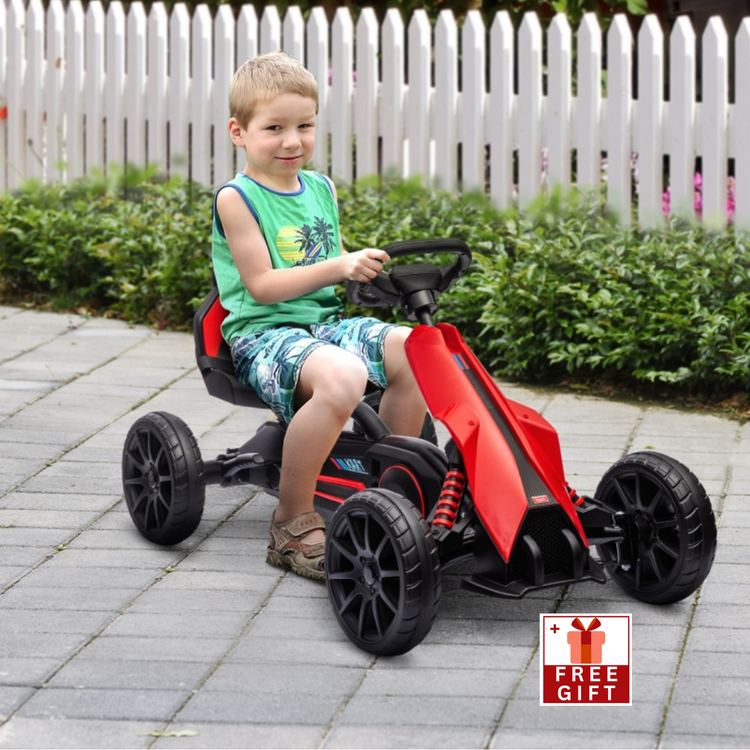 Our Kids Ride-On Toy Pedal Go Kart with Adjustable Seat is designed for years of fun-filled adventures. Featuring a 4-position adjustable seat with a 5.5" range, it ensures a comfortable fit for children of varying heights. Your child can easily navigate in any direction, thanks to the superior control provided by the forward and reverse drive and hand brake. The ride-on go-kart's silent and shock-absorbing EVA wheels and swing axle guarantee a smooth and stable ride on various surfaces, including cement, brick, gravel, and asphalt roads.