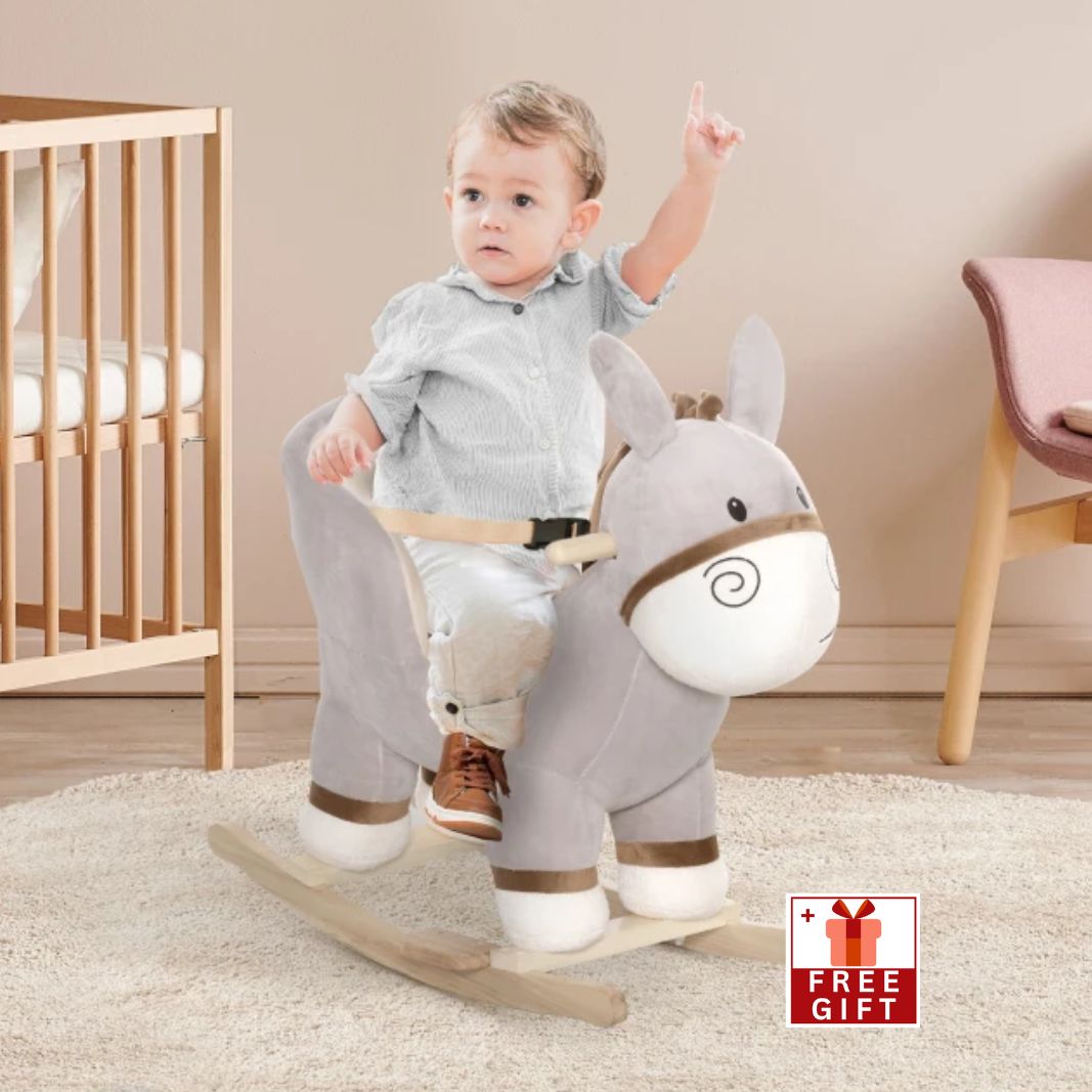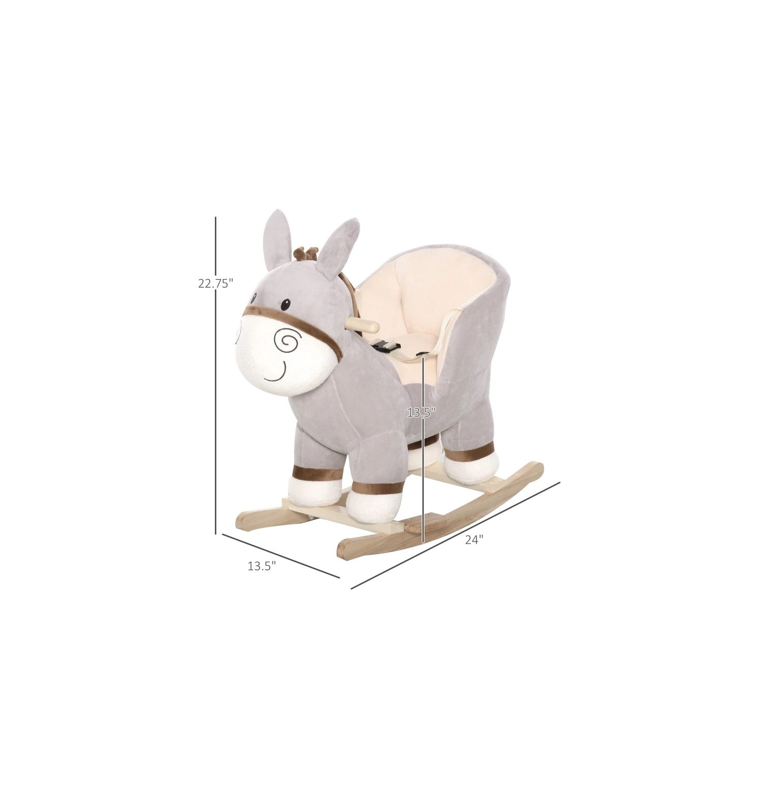 Kids Rocking Chair, Plush Ride On Rocking Horse Donkey with Sound, Wood Base Seat, Safety Belt, Baby Toddler Rocker Toy for 18 - 36 Months, Gray