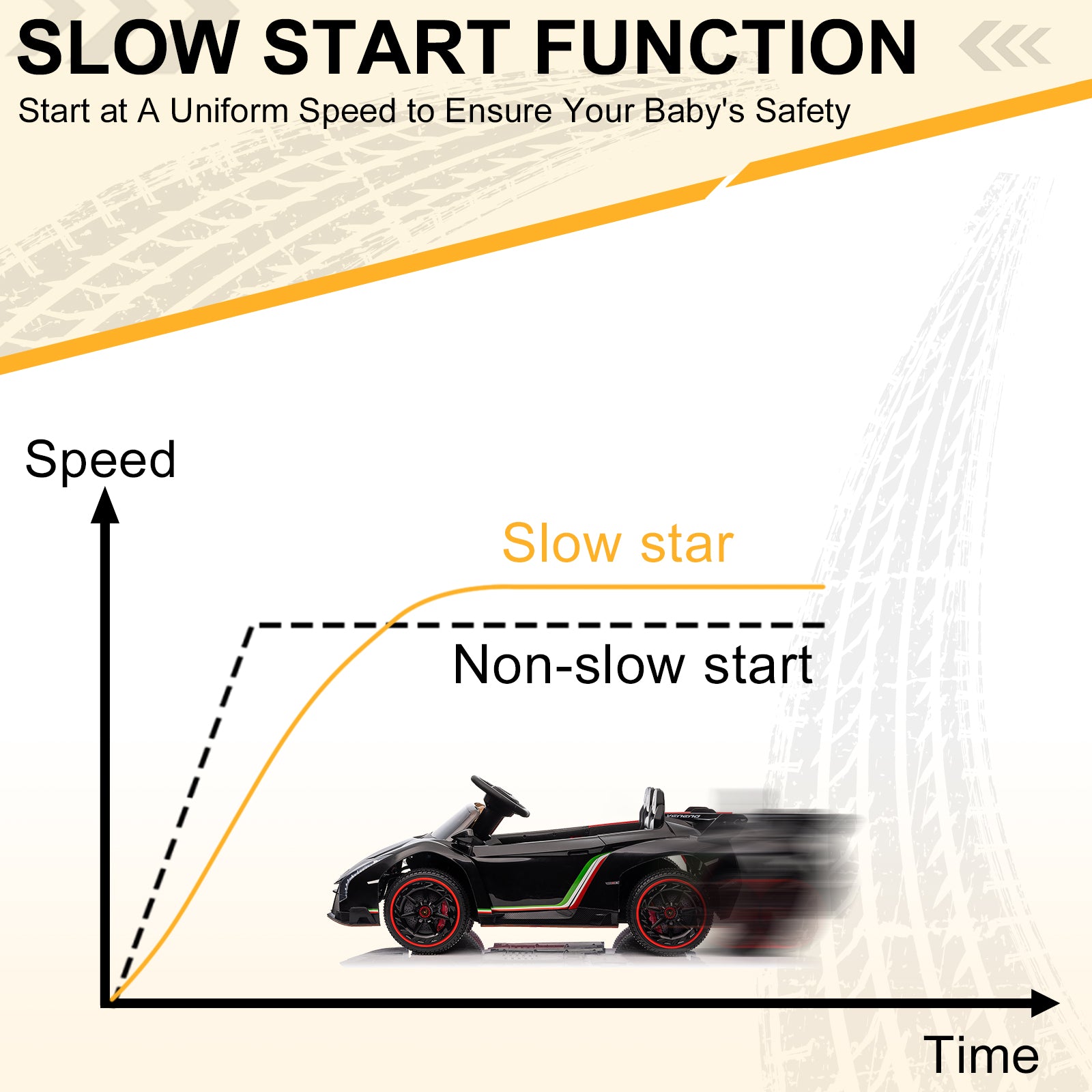 - 2 speeds accessible feature allows parents to control the speed of the car for added safety