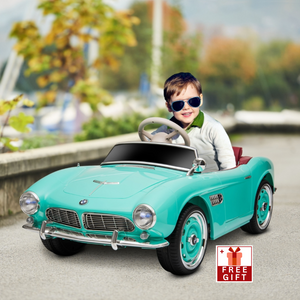 Your child will feel classic-cool with the BMW 507 licensed ride-on car. With the wind in their hair, they'll experience the thrill of the road, enjoying the great outdoors to the sounds of their favorite songs with Bluetooth, AUX, and USB capability. But the realism doesn't stop there; they can also honk the horn, turn on the headlights, and admire the light-up dashboard. Wide wheels provide traction, and a seat belt securely straps them in for an unforgettable ride, all designed with safety in mind. The BMW 507 licensed car features doors on both ends for easy entry and exit, and it's easy to transport when not in use with a convenient handle and an extra set of wheels. This BMW toy car ride on wheels and steering wheel can be removed for storage, and the car can be controlled by the child in the driver's seat or by the parent using the remote control. The BMW power wheels slow start mechanism gives your child time to react for greater safety, and the shock-absorbing wheels ensure a smooth ride. Plus, a power indicator lets you monitor how much battery is remaining. Assembly is required, but the fun is guaranteed!