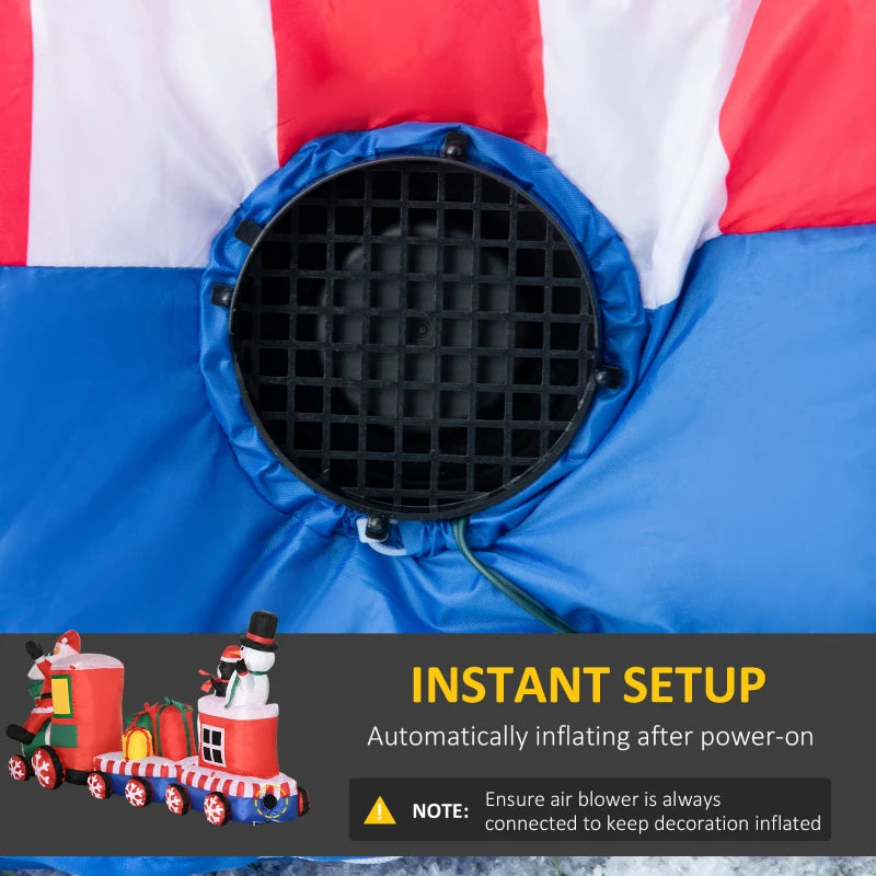 The Outsunny 8FT Christmas Inflatable Train featuring Santa Claus, a snowman, and a penguin with gift boxes bring a festive, cohesive display to your outdoor holiday decorations. Bright white LED lights add a magical touch, ensuring it stands out day or night. This weather-resistant inflatable is easy to set up with automatic inflation and deflates for compact storage. It includes stakes, drawstrings, and a sandbag to keep it securely anchored. Made from IP44-certified polyester, it’s perfect for indoor or outdoor Christmas decor.