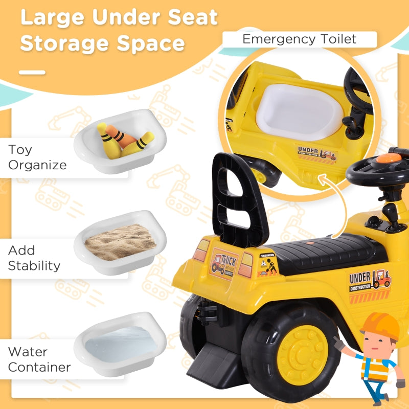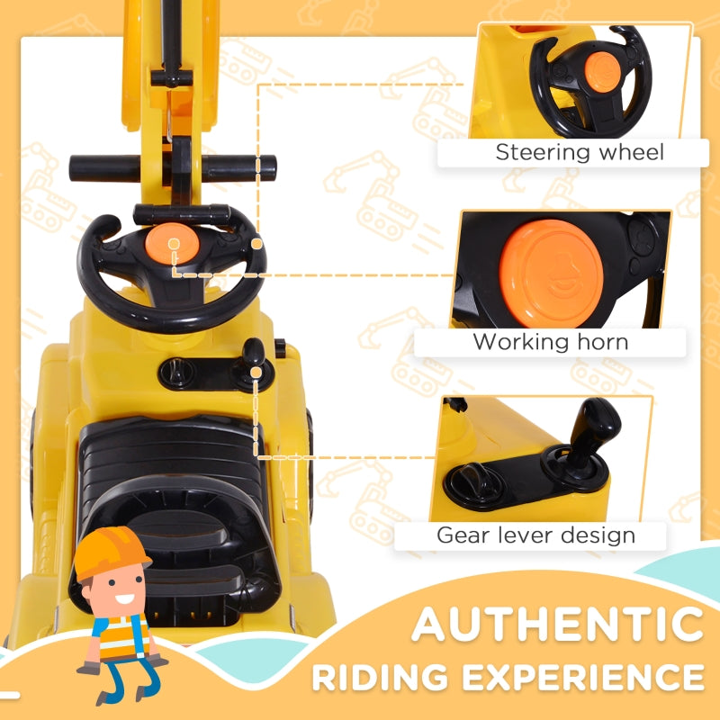 - Under-seat Storage: The Excavator ride on toy under-seat storage allows kids to bring along their favorite toys on the ride. They can transport plush animals or other toys with ease. A honking horn adds to the fun.