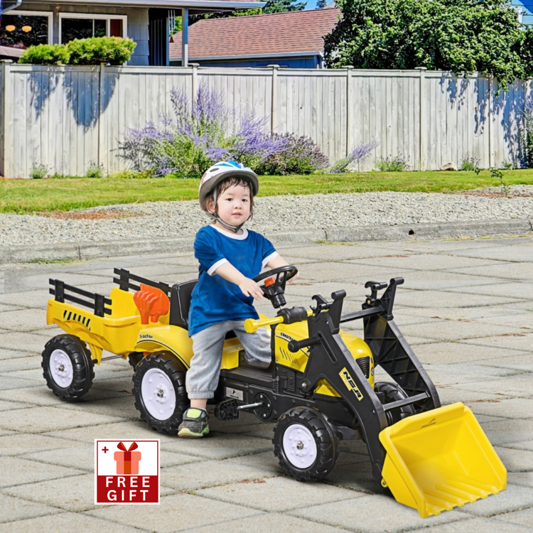 Ignite your child's imagination with this realistic Ride-On Toy Excavator. Perfect for outdoor play, this Ride on bulldozer for kids construction equipment features a functional front bucket that can be lifted and lowered, allowing your child to scoop up dirt and sand just like a real excavator. The Tractors for Kids extended storage area and included toy tools add to the fun and creativity of the play experience. With a sturdy metal frame and quality plastic construction, this power wheel tractor can support weights up to 77 lbs. The pedal-powered design enables easy movement in both forward and backward directions. Additionally, the excavator and trailer are detachable for convenient storage. Suitable for children ages 3 to 6 years old, this tractor ride on toy requires assembly and promises hours of imaginative play.