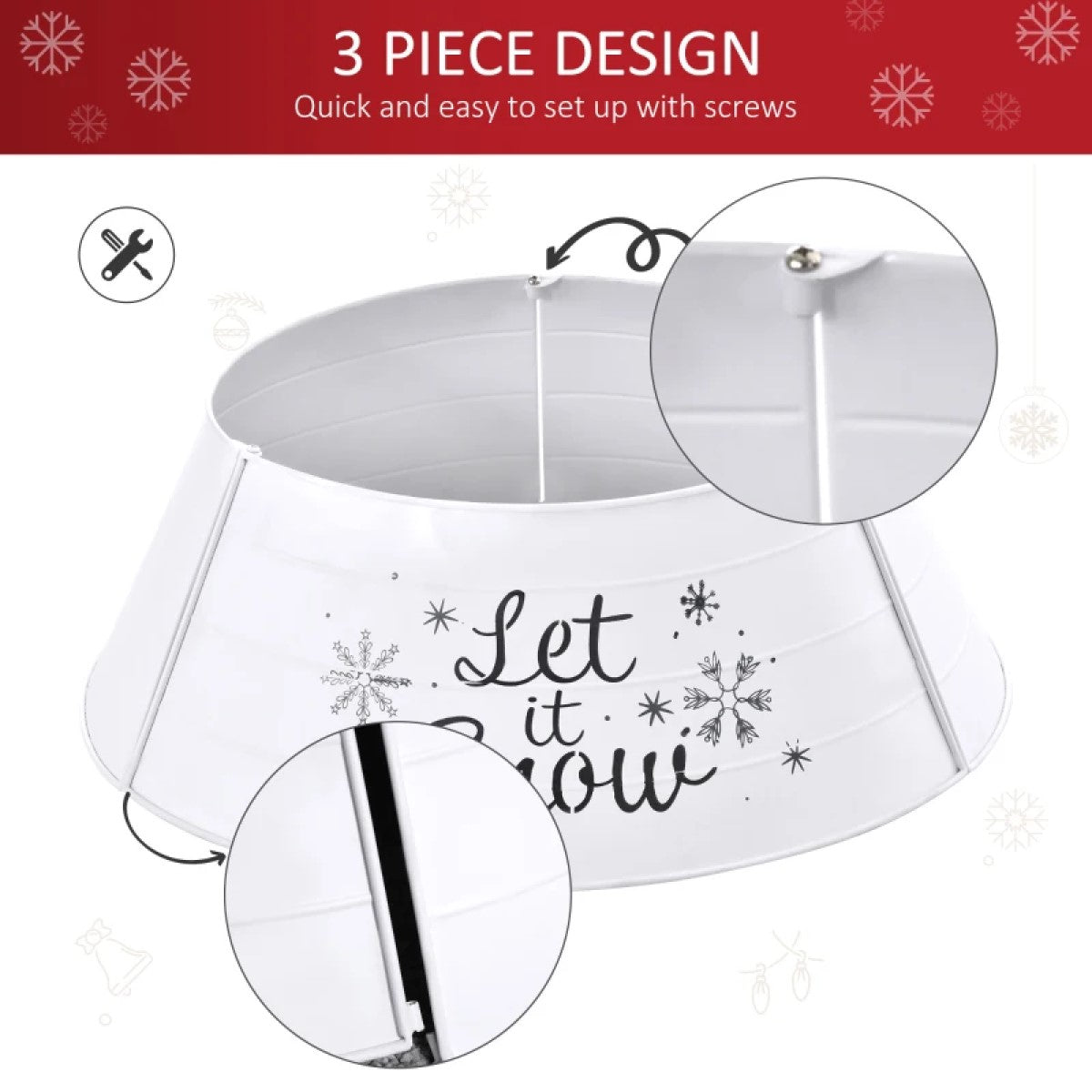 Elevate your holiday decor with the Steel Christmas Tree Collar Ring Skirt. Featuring a bright silver finish with snowflake engravings, this elegant tree collar design conceals your tree stand while keeping pets and kids away. Unlike traditional fabric skirts, it requires no rearranging and is made from durable steel with an eco-friendly coating. Measuring 26" x 26" x 9", this versatile collar suits large, slim, or small tabletop trees. Its three-piece design allows for quick setup and disassembly, making it a practical choice for storage. Add charm and functionality to your festive celebrations with this beautiful Christmas tree collar decoration!