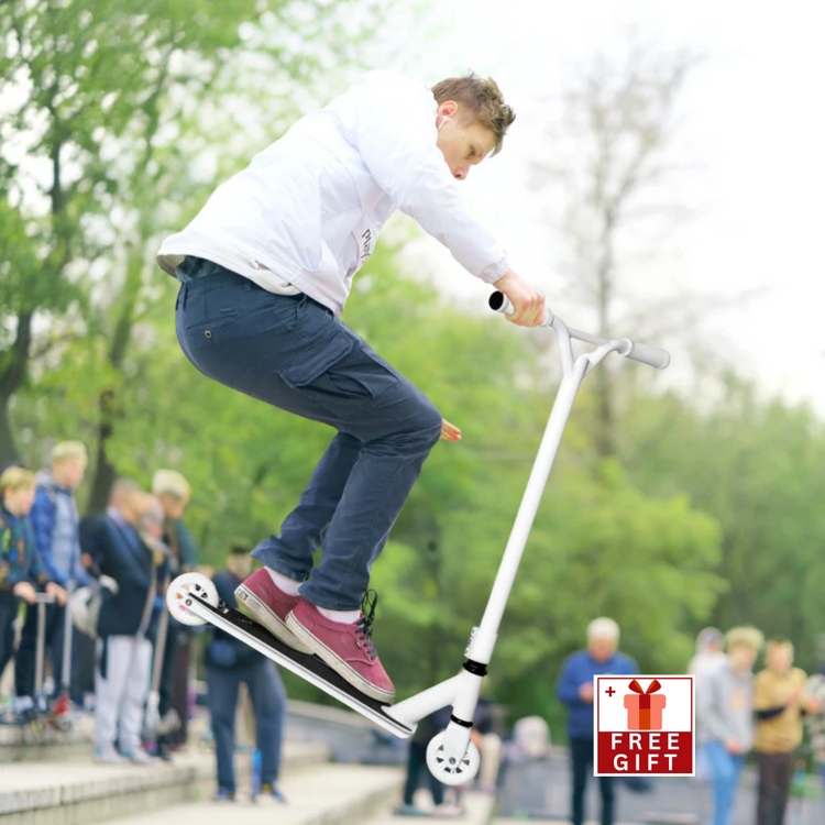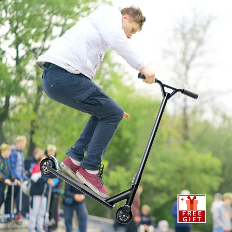 Get ready to soar with the Stunt Scooter, a ride-on scooter for teens and adults who love freestyle riding. This pro scooter toy ride-on features a lightweight aluminum frame that allows you to fly through the air with ease. Perfect for beginners, this ride-on scooter offers a lightweight design that reduces the effort needed to gain momentum, making it easier to perform tricks and stunts.