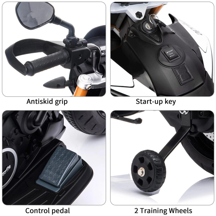 Powered by a powerful 12V battery, this toy motorcycle comes equipped with two removable auxiliary wheels, anti-slip handlebars, speed limit, overload protection, rear shock absorber, and front and rear lights. It also features an MP3 player with music and USB functionality, allowing your kids to enjoy their favorite tunes while riding.