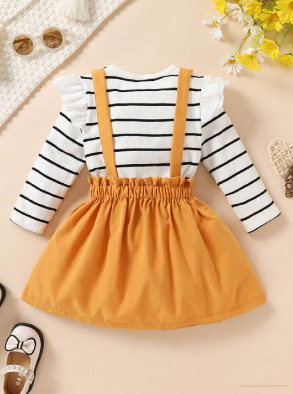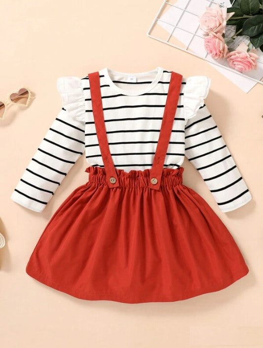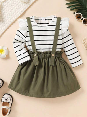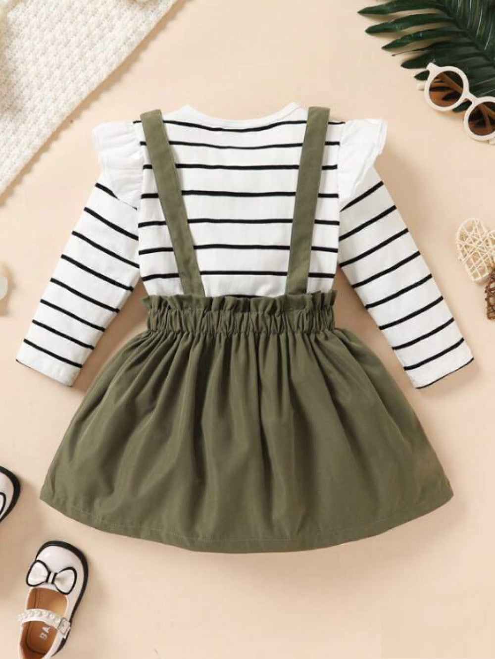 Young Girl 2pcs Cute Striped Print Tee With Leafy Hem And Suspender Skirt, Soft Comfortable Sweet Style