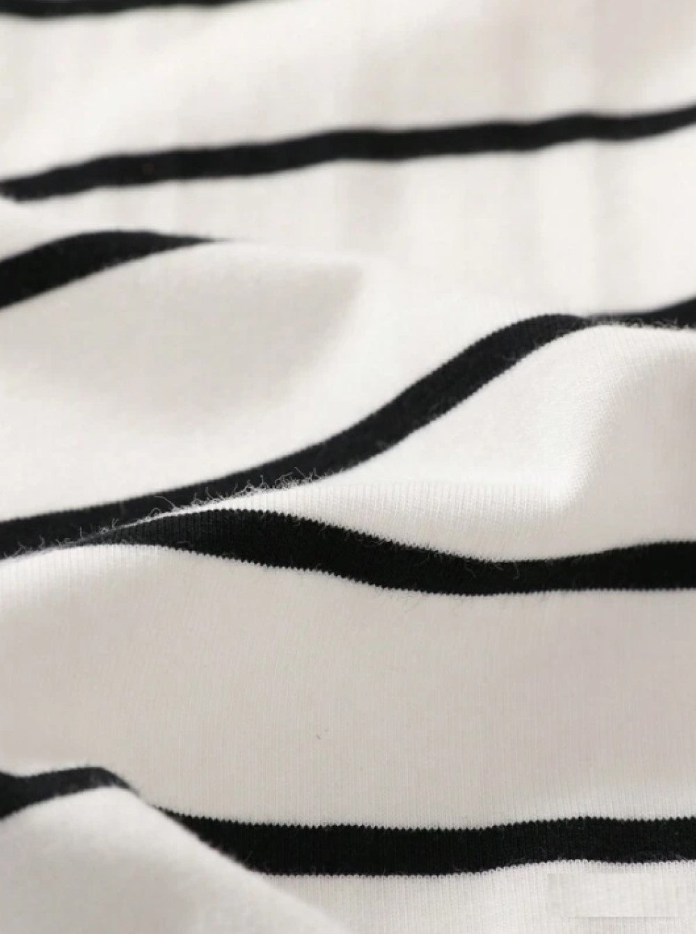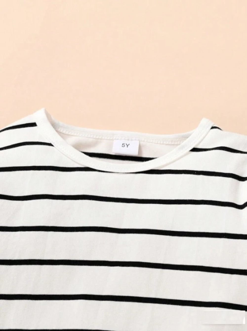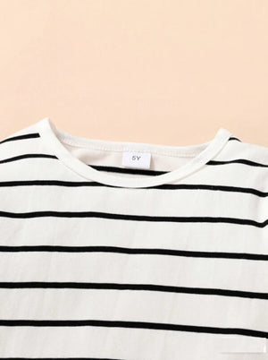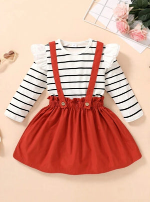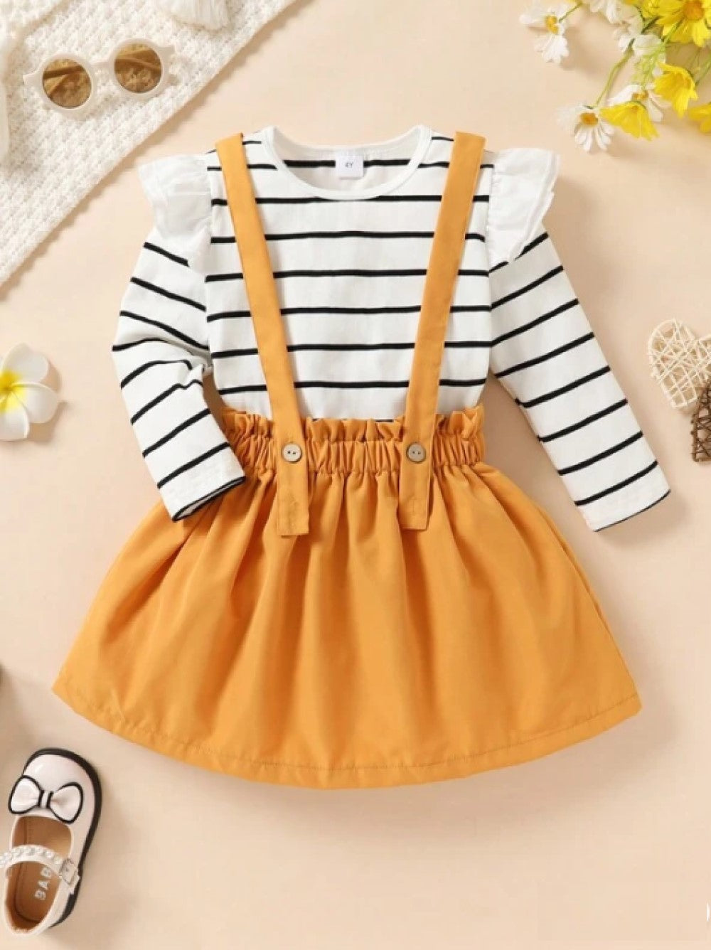 Young Girl 2pcs Cute Striped Print Tee With Leafy Hem And Suspender Skirt, Soft Comfortable Sweet Style